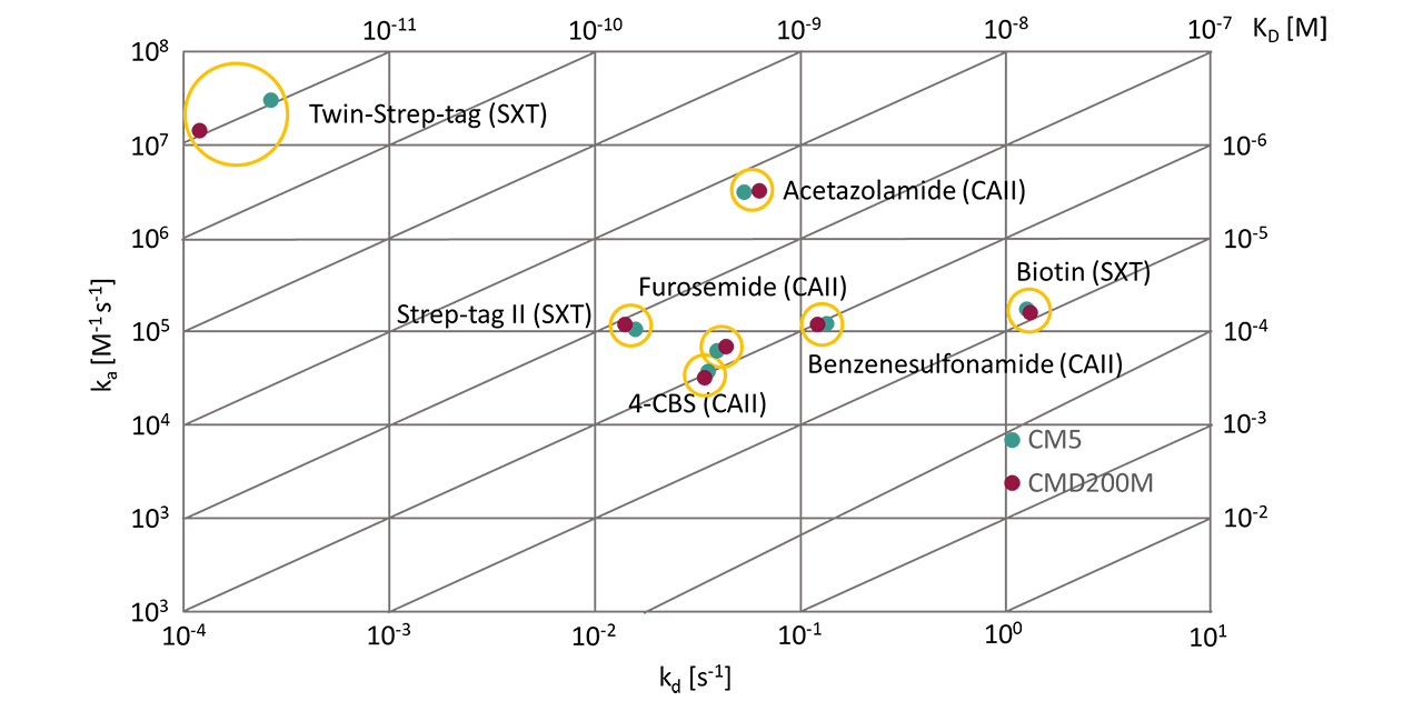 Building on these findings, both sensor chips were further evaluated to determine whether systematic deviations in equilibrium or rate constants occur during biomolecular interaction analysis. Two model systems were selected for this purpose. The first used the zinc-containing metalloenzyme CAII that catalyzes the reversible hydration of carbon dioxide to bicarbonate and protons. Due to its well-characterized structure, high stability, and reproducible immobilization, CAII serves as a benchmark protein for assessing small-molecule binding in SPR [3][4]. Its sulfonamide-based inhibitors cover affinity ranges from micromolar to nanomolar, making it ideal for sensor chip comparison. Meanwhile, the Strep-Tactin XT platform extends the benchmark to larger peptide analytes [5]. Here, affinity increased with analyte size, from biotin (240 Da) to Strep-tag II (1.1 kDa) and Twin-Strep-tag (3 kDa), spanning micromolar to picomolar equilibrium dissociation constant (KD) values.