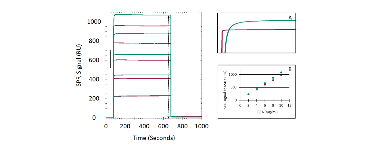 Optical assessment of both sensor chips revealed neglectable differences. Both sensor chips displayed RMS noise ≤ 0.033 RU over a period of 600 s. The bulk refractive index sensitivity—determined by the SPR signal shift after injection of 50% glycerol in water—varied by < 1 %, indicating a similar occupation of the evanescent field by the CMD hydrogel matrix.