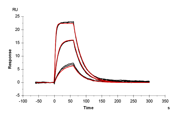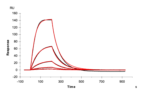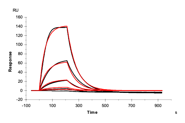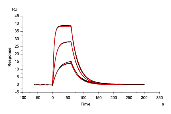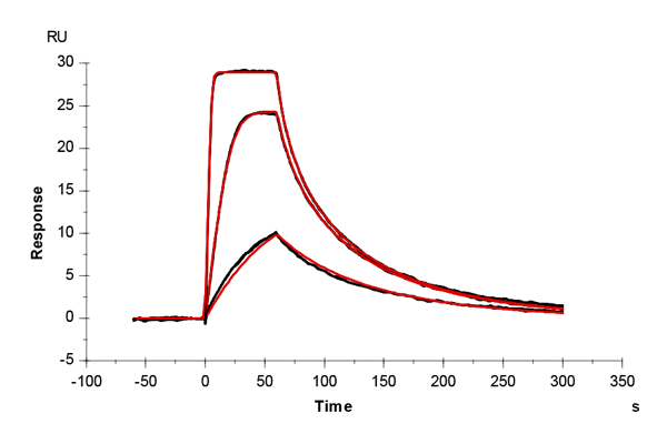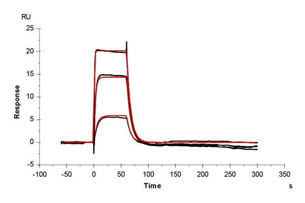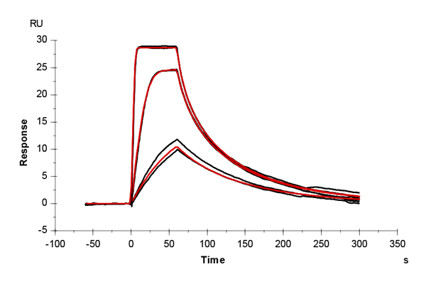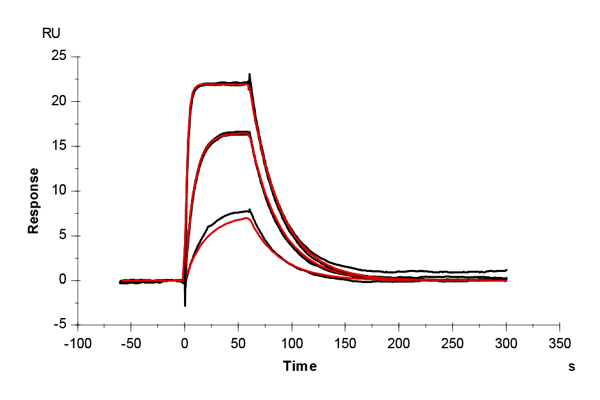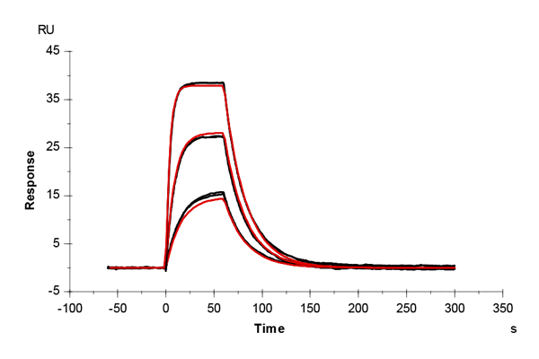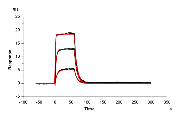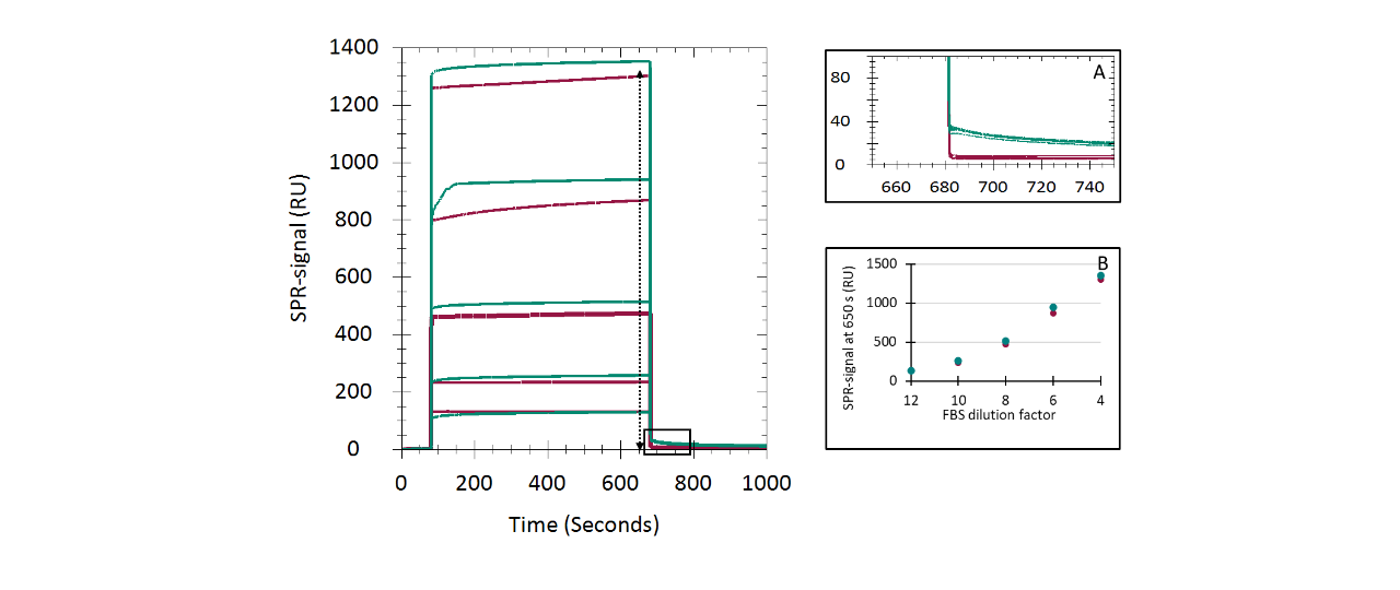 The sensor surface was conditioned as described above and equilibrated in running buffer (PBS + 0.03% sodium azide) until a stable baseline was achieved. The SPR signal was recorded for 600 s at 50 µL/min.
