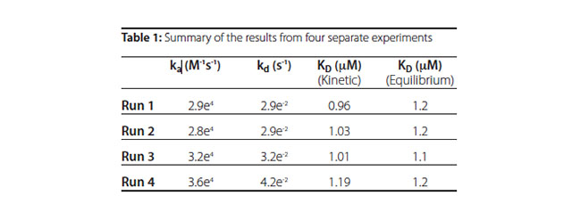 Table 1 presents the association and dissociation rate binding isotherm. constants determined from fits to a simple bimolecular model in Scrubber along with the equilibrium dissociation constants (KD) calculated from the kinetic and equilibrium data, respectively. The results show that the system is highly reproducible and the KD values determined through the kinetic and equilibrium analysis are in very good agreement with each other and correlate very well with that reported in the literature.